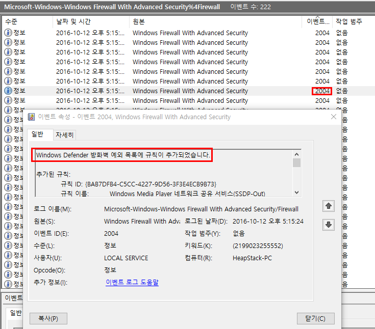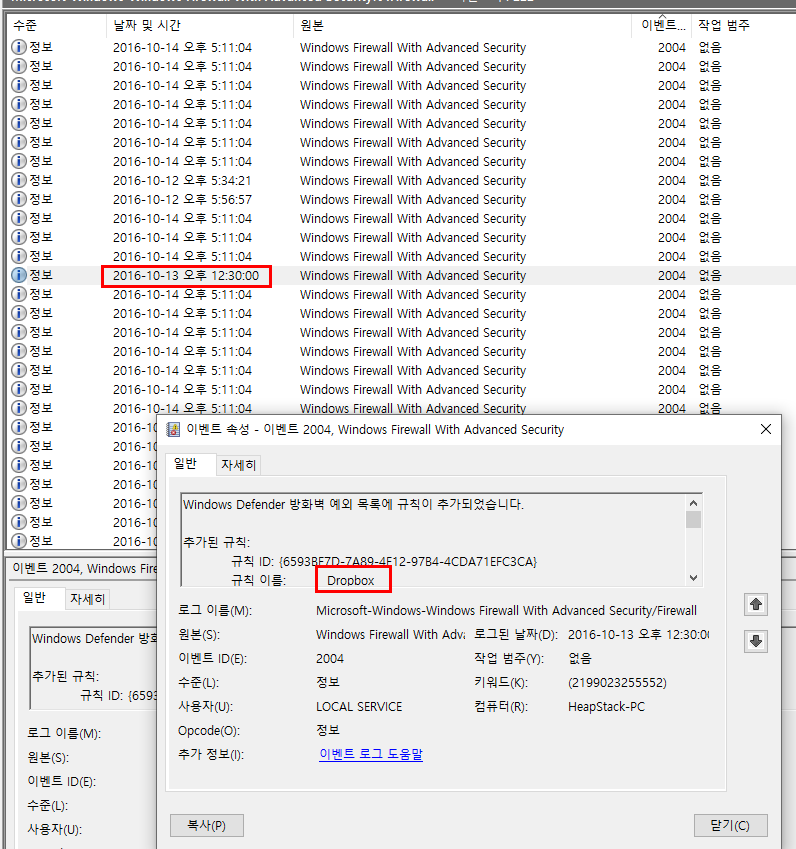 그렇다면 방화벽에서 예외로 등록한 시점을 찾아야한다.