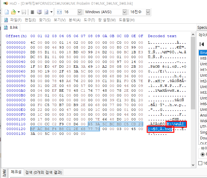하지만 이름은 E:\??????.hwp 인것을 확인할 수 있는데 문제에서 나온 EUR_KR인코딩을 해보도록 하자..