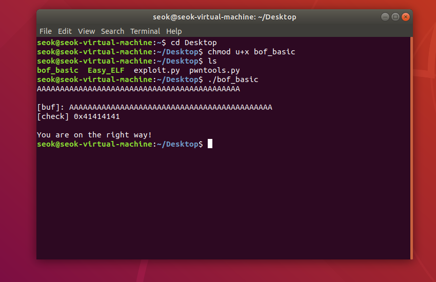 그래서 보기 편하게 바탕화면으로 bof_basic을 옮겨준 후에 chmod u+x bof_basic을 하여 유저에게 excute권한을 준다