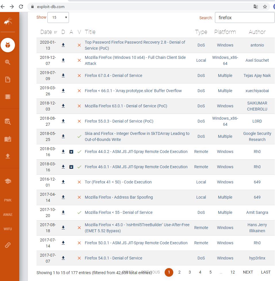위의 Search 창에다가 firefox를 치면 여러 종류의 취약점들이 나오게 되는데 우리는 체크 표시가되있는