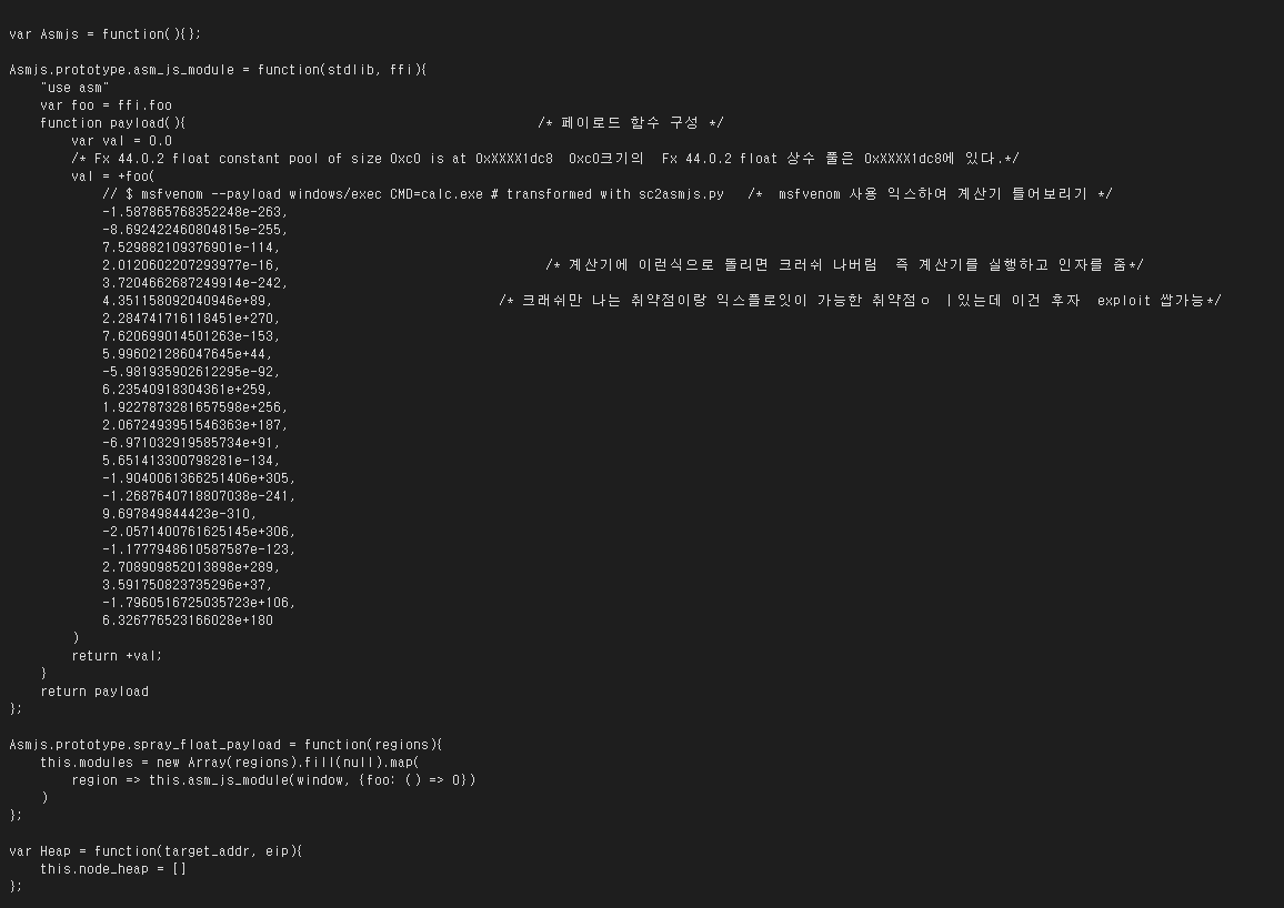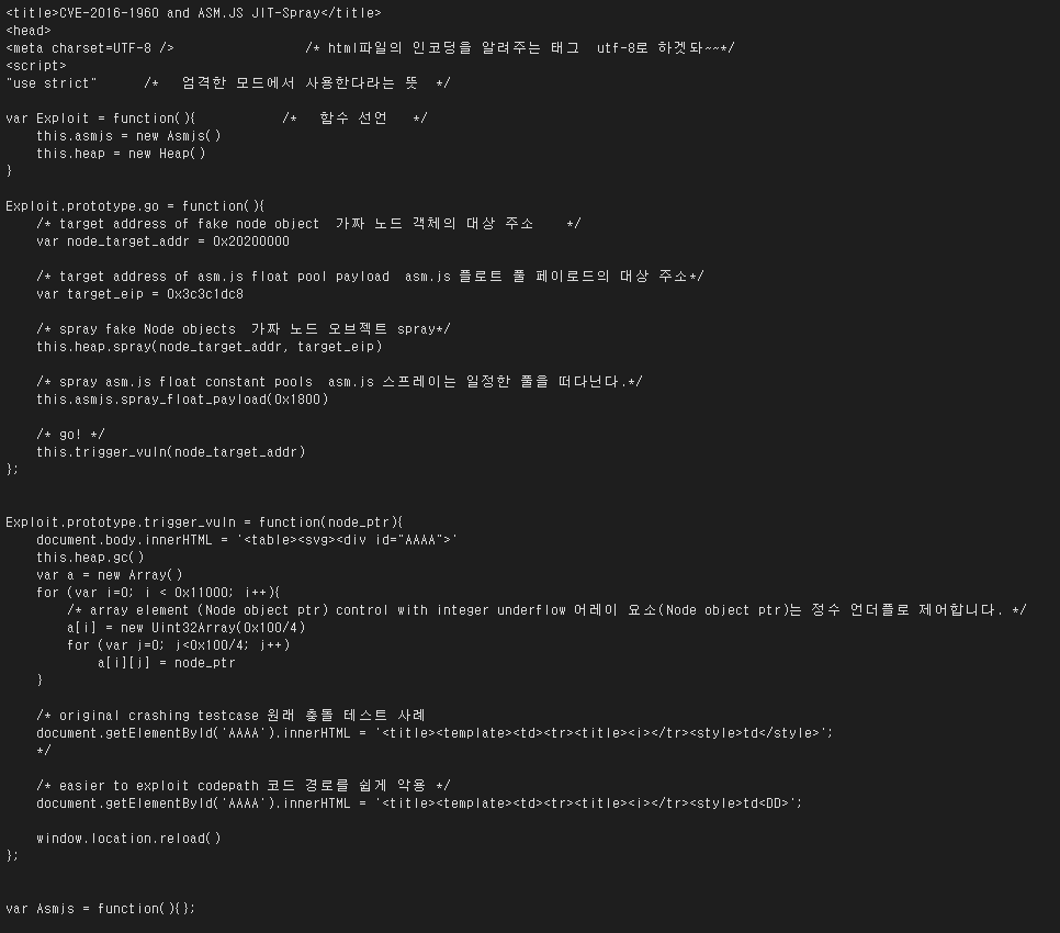 자 이제 코드를 분석하기 이전에 우리가 얻은 Keyword인 ASM.JS, JIT SPRAY, ASLR 및 DEP 우회 방법을