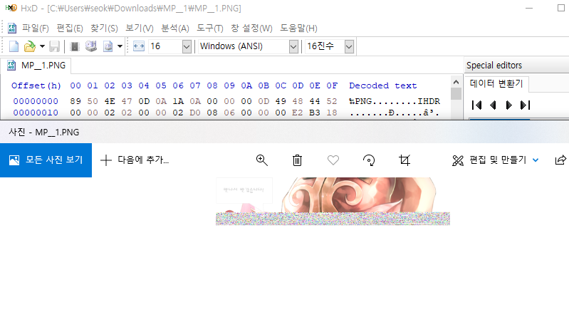 89 50 4e 47 0d 0a 1a 0a 형식이어야 하기 때문에 바꿔주니 깨진 사진이 나온다.